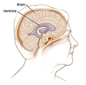 Cutaway view of ventricles showing enlarged ventricles and subarachnoid space